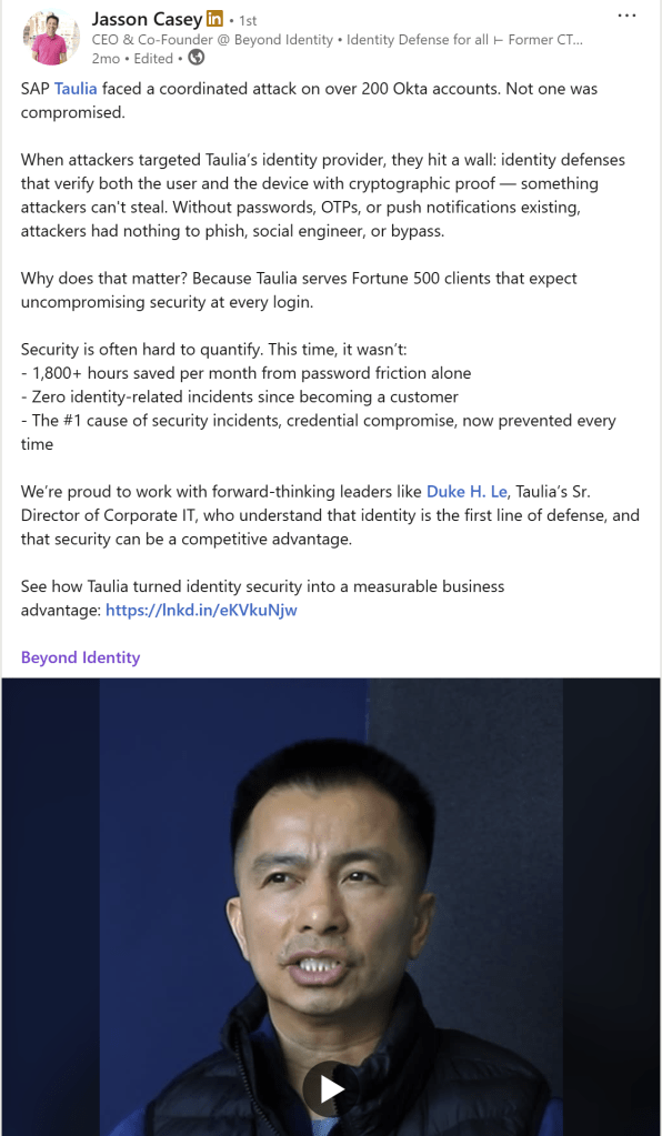 Filmed with the CEO of this MSSP at the Beyond Identity office to create a written and video testimonial as well as social shorts. The full written testimonial is available here.
