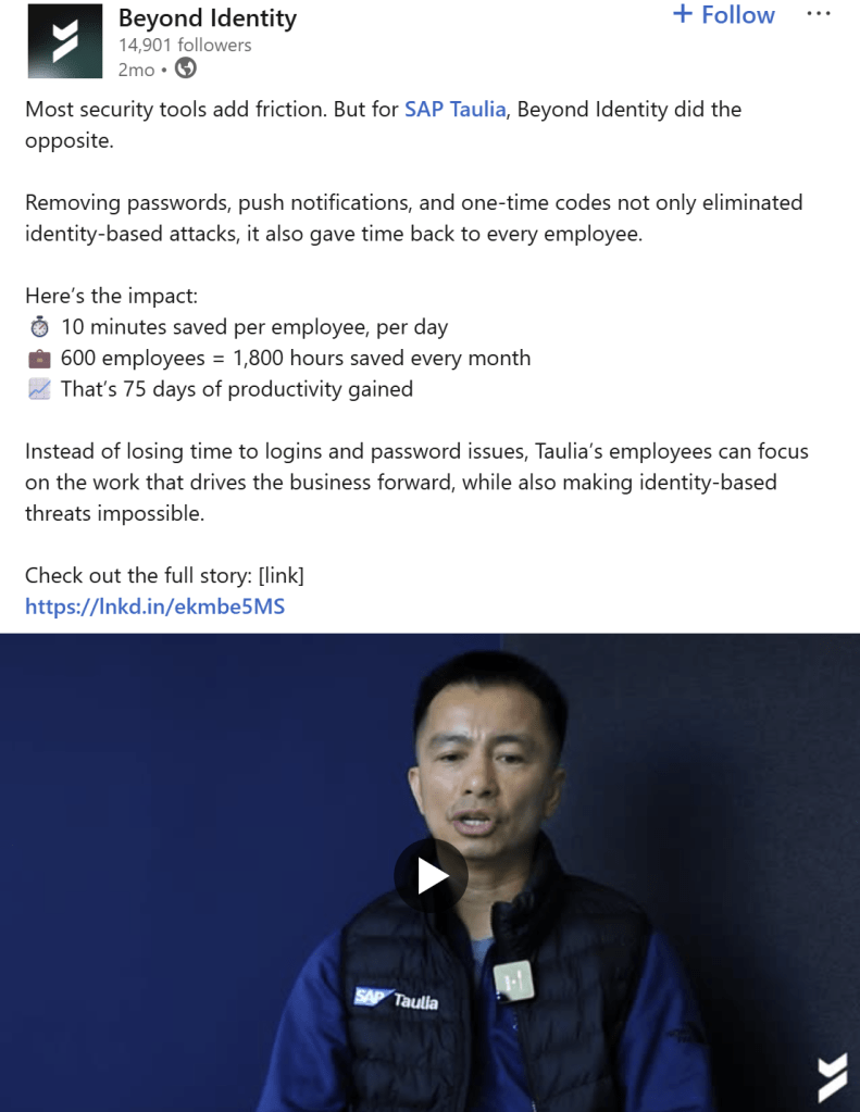- Crafted narratives that highlighted each customer’s challenge and how Beyond Identity’s solution drove results